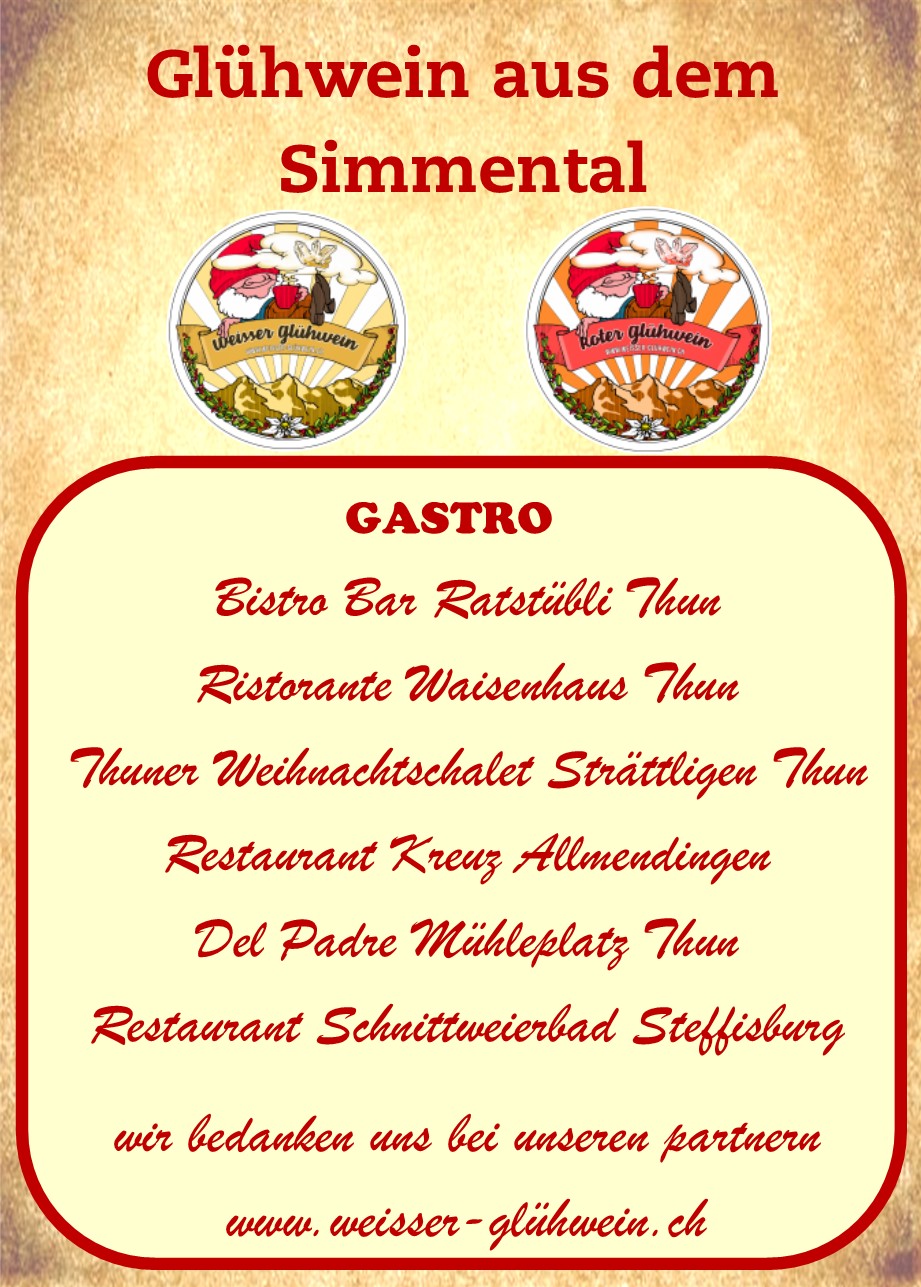 Glühwein, Fruchtpunch, regionale Bier Chäsbrägel, Hüsi Popcorn, Boltig Lebkuchen